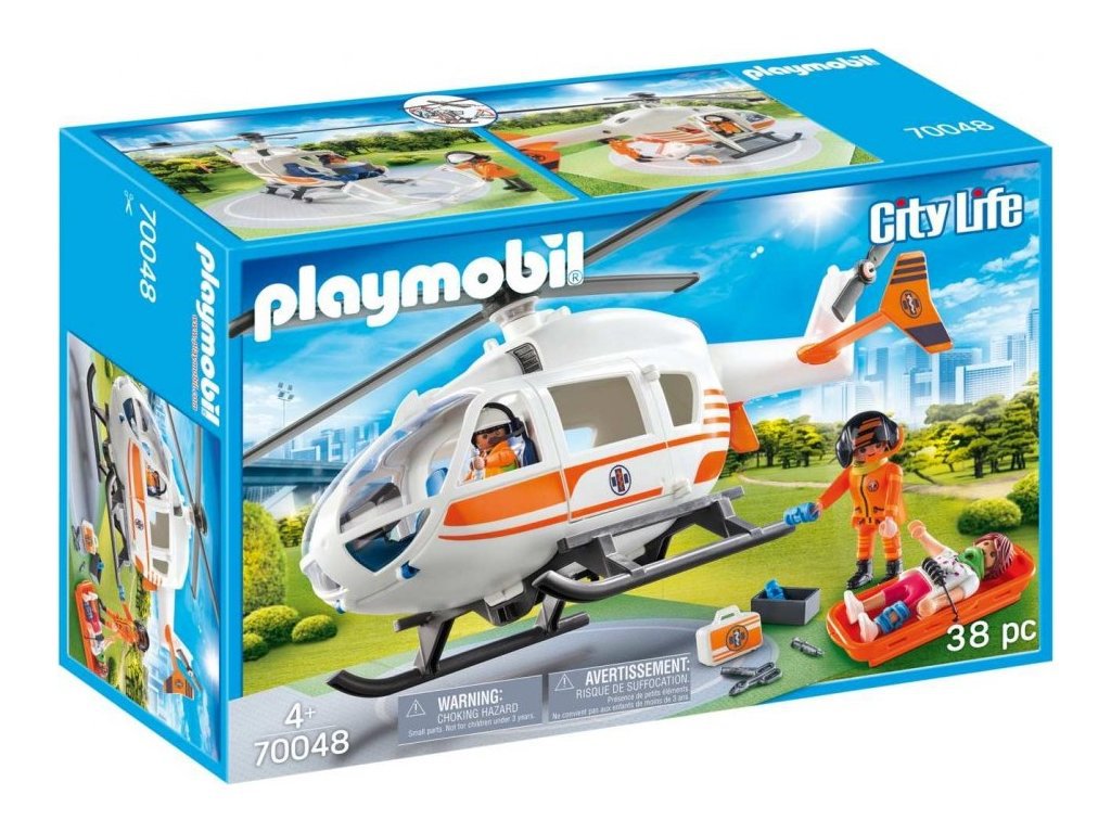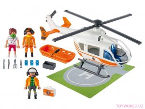 Záchranný tým PLAYMOBIL dostává mimořádně naléhavý úkol záchrany ze vzduchu. Pohotovostní lékař rychle letí poskytnout první pomoc. Žena měla nehodu a leží zraněná na ulici. Lékař reaguje rychle: navlékne krční límec, obváže ránu na noze a pak zraněnou naloží na transportních nosítkách do vrtulníku. Díky této skvělé první pomoci bude pacientka brzy v pořádku.