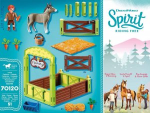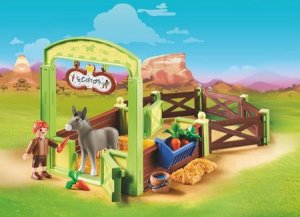 Playmobil 70120 Koňský box Šmik a Seňor Mrkvička Mladší bratr dívky Lucky Šmik se stará o svého oslíka, Seňora Mrkvičku. Vybavený box pro oslíka s jmenovkou a malým výběhem.