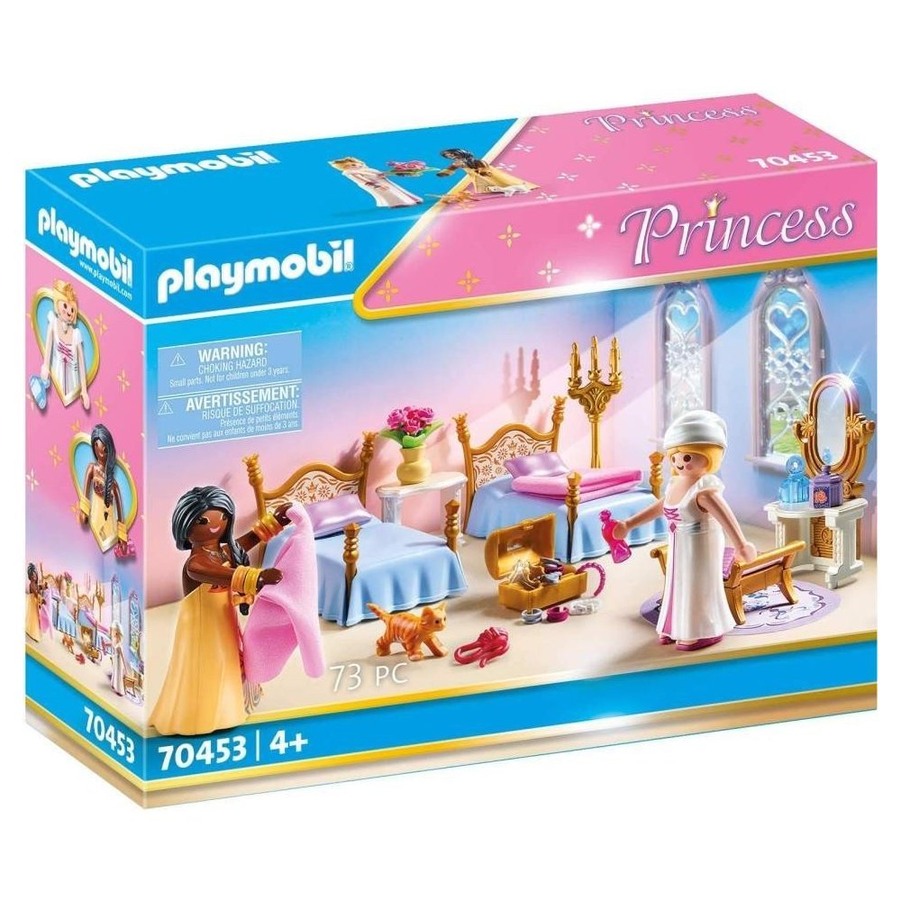 Herní sada obsahuje dvě figurky PLAYMOBIL, princeznu Bintou z Afriky a další princeznu, dvě postele s polštáři a přikrývkami, svícen, toaletní stolek se zrcadlem a stoličkou a další doplňky.