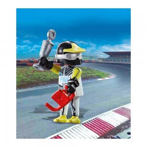 Motorsport je závodníkovou vášní, a proto jezdec trénuje každý den několik hodin. Přejel přes cílovou čáru jako první. Ve svém posledním závodě tak vítězí a získává pohár! balení obsahuje: 1x figurku a další doplňky