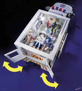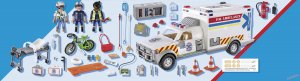 Sada obsahuje sanitku, lékaře a dva záchranáře, muže, jízdní kolo, sanitní nosítka, lékařský kufr, diagnostickou desku a mnoho dalších doplňků pro vzrušující záchranné operace.