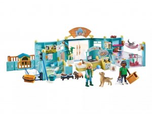• Vítejte v PLAYMOBIL hotelu pro mazlíčky – luxus pro každého zvířecího hosta! Ve zvířecím hotelu dostávají psi, kočky a dokonce i hravý papoušek prvotřídní péči. Pro každého je ideální místo: psi si užívají útulných kotců a mycí stanice s funkční ruční sprchou, zatímco kočky odpočívají v houpacích sítích nebo dovádějí s hračkami. Přiložené jmenovky lze použít k individuálnímu označení krmných prkýnek a hotel lze vyzdobit dle přání.