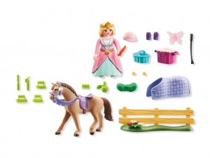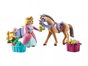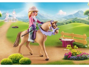 Kouzelná princezna a její věrný kůň - perfektní sada pro všechny malé princezny. Tento elegantní set obsahuje figurku princezny se snímatelnou sukní, která umožňuje pohodlně nasednout na koně. Po dlouhé jízdě lze koni dopřát pochoutku v podobě mrkve a přikrývku. Na slavnostní příležitosti můžete ozdobit uzdu koně třpytivými mašličkami a hvězdičkami. Sada zahrnuje přikrývku, šťavnatou mrkev, ozdoby pro uzdu koně a nástroje pro péči. Princezna může vyměnit korunu za jezdeckou přilbu a rukavice a být připravena na nové dobrodružství. Motýlek je bude doprovázet na jejich cestách po loukách. Sada obsahuje sedlo, košík s pamlskem a další doplňky pro inspiraci k vynalézání nekonečných příběhů. Ideální hračka pro rozvoj představivosti a kreativní hry.