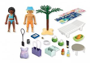 Obsahuje:1 muž s kloboukem, 1 žena s náhradním oblečením, 2 lehátka, 2 ručníky, 1 palma, 1 odkládací stolek, 2 melounové nápoje, 1 mísa s ananasem, 1 plážová taška, 1 čtečka, 1 chladicí taška s nápoji, 1 náramek, 1 MP3 přehrávač, 1 opalovací krém.