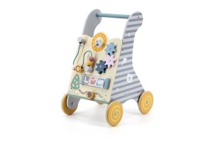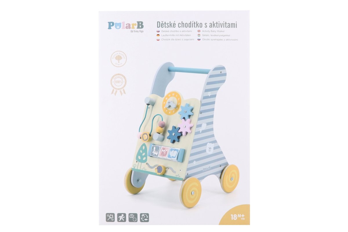 Dřevěné chodítko s herními prvky pro rozvíjení dětské chůze a motoriky, v české krabici. Rozměry cca 45 x 26,7 x 31 cm. Obsahuje různé provlékačky, bludiště a otáčecí hračky. Rozměry balení cca 34 x 47,5 x 11 cm. Věk 18m+